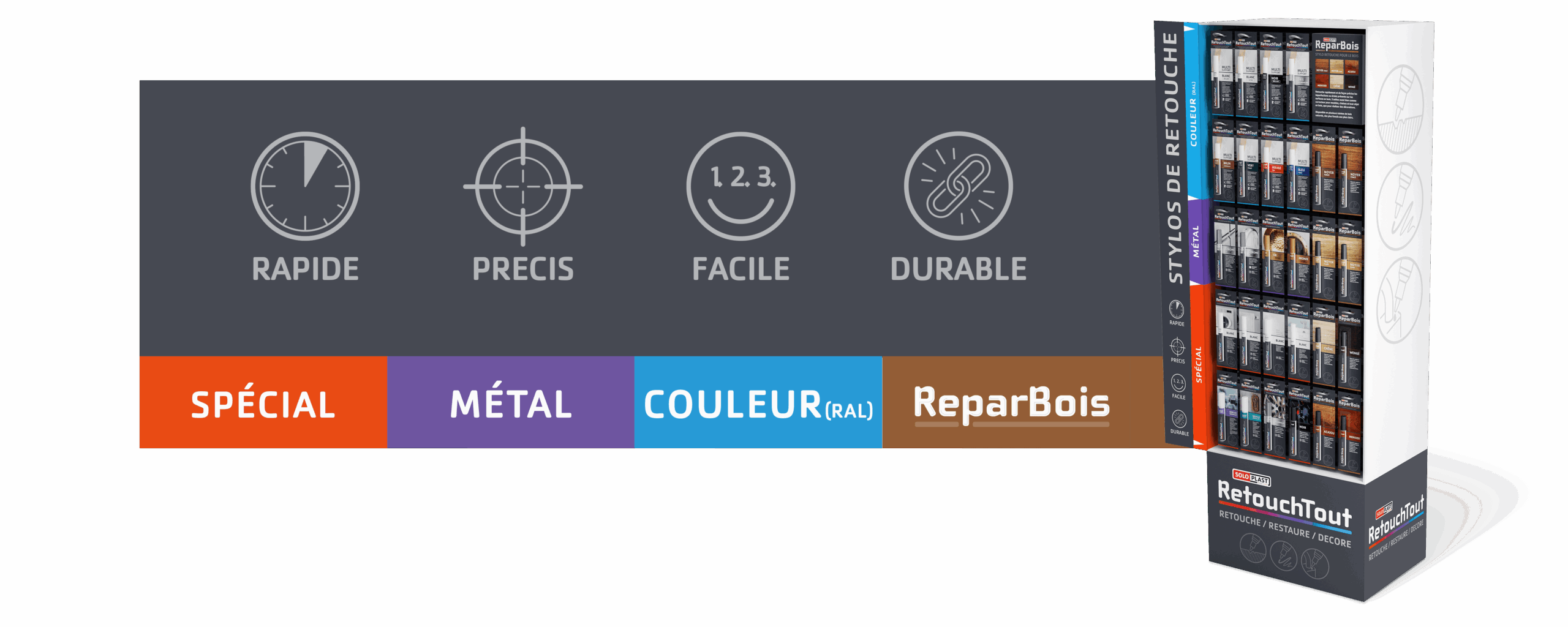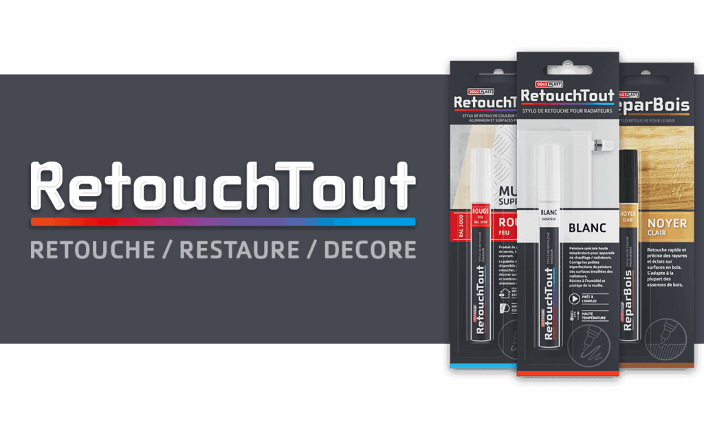 RetouchTout est la gamme de Soloplast dédiée aux retouches rapides, précises et durables des surfaces abîmées du quotidien.